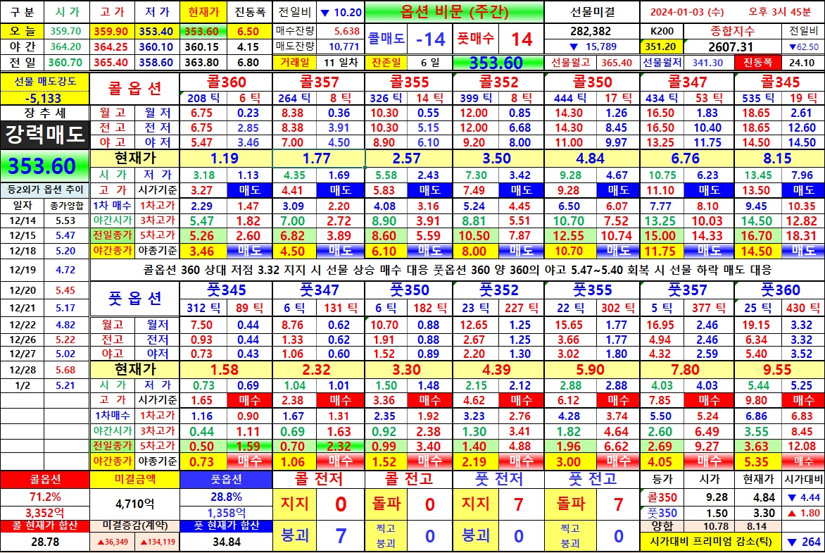 콜옵션 360 상대 저점 3.32 지지, 양 357 4.50~4.32 교차, 풋옵션 360 상대 야고 5.47 회복 못함, 양 360 상대 고점