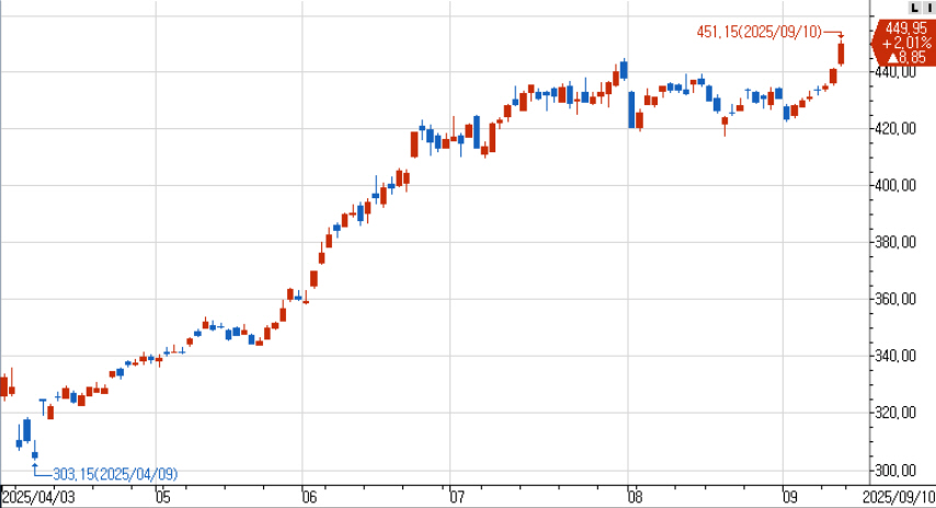 상승해서 451.15의 장중고점을 찍고 449.95로 전일대비 8.85포인트 상승한 상태로