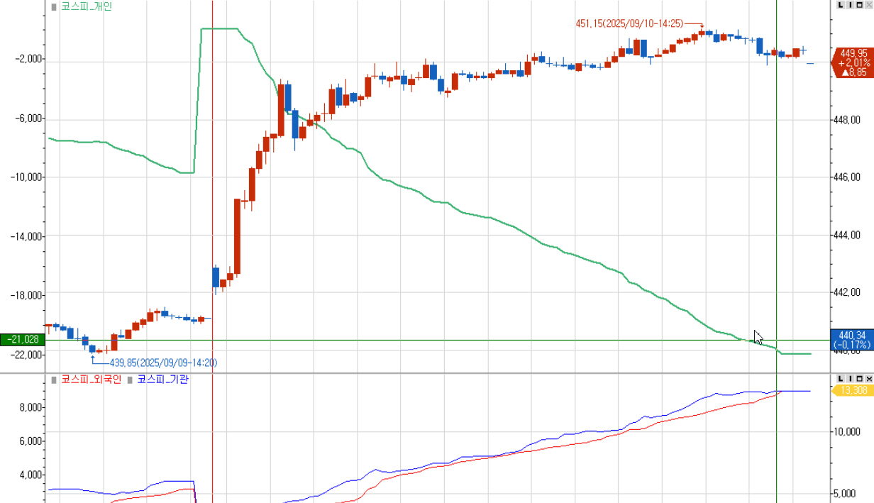 오늘 선물지수는 442.85로 갭상승 시작했습니다. 이후 지수는 고점을 높여가면서
