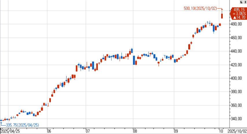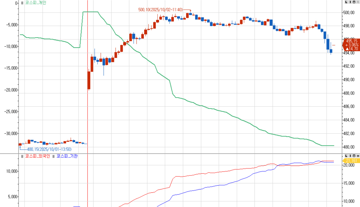 목요일 선물지수는 488.60으로 갭상승 시작했습니다. 이후 지수는 500.10의