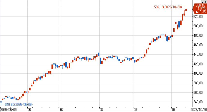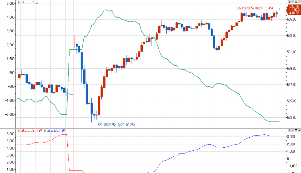 장중저점을 찍은 이후 다시 상승세로 돌아서서 시가를 넘어서 536.15로