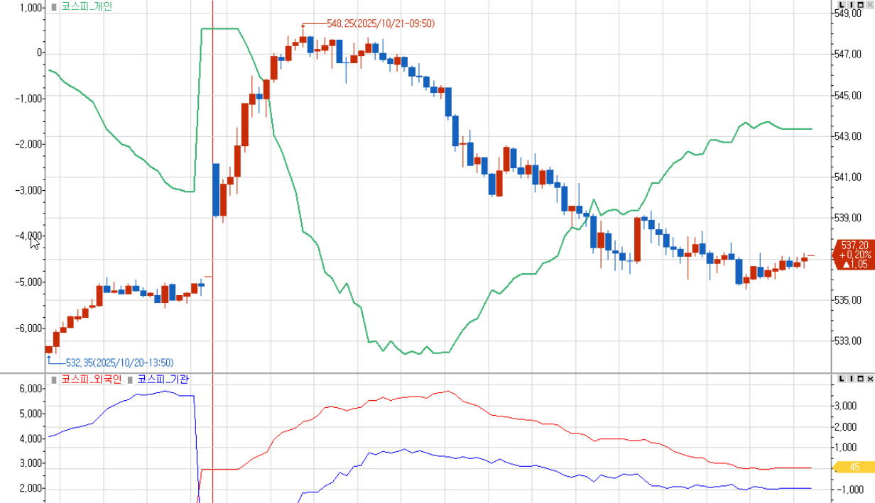 찍은 이후 하락세로 전환되어 상승분을 되돌리고 흘러내려서 537.20으로 전일대비