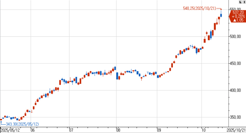 오늘 선물지수는 541.65로 갭상승 시작했습니다. 이후 지수는 548.25의 장중고점을