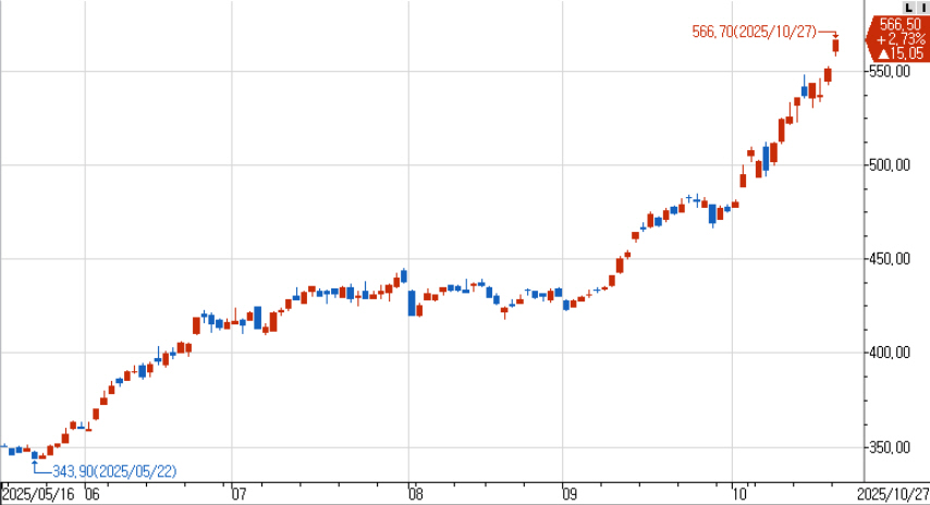 양상입니다. 지난 주말에 550대를 돌파한 지수는 오늘 560대를 넘어서면서