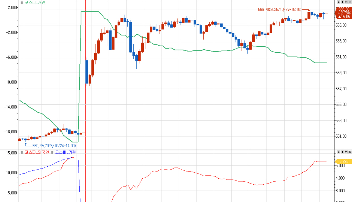 오늘 선물지수는 560.55로 갭상승 시작했습니다. 이후 지수는 등락을 반복하며