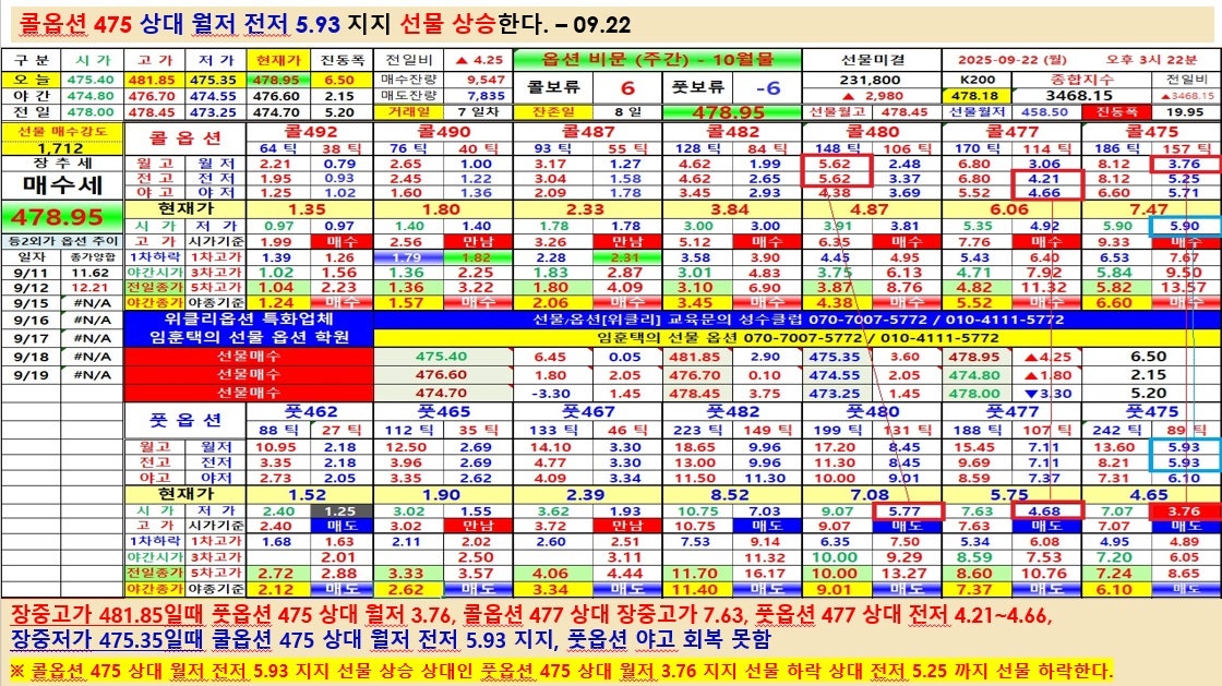 콜옵션 475 상대 월저 전저 5.93 지지 선물 상승한다. - 09.22