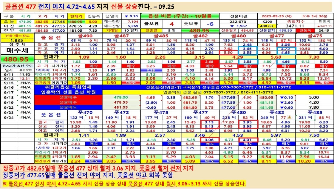 콜옵션 477 전저 야저 4.72~4.65 지지 선물 상승한다. – 09.25