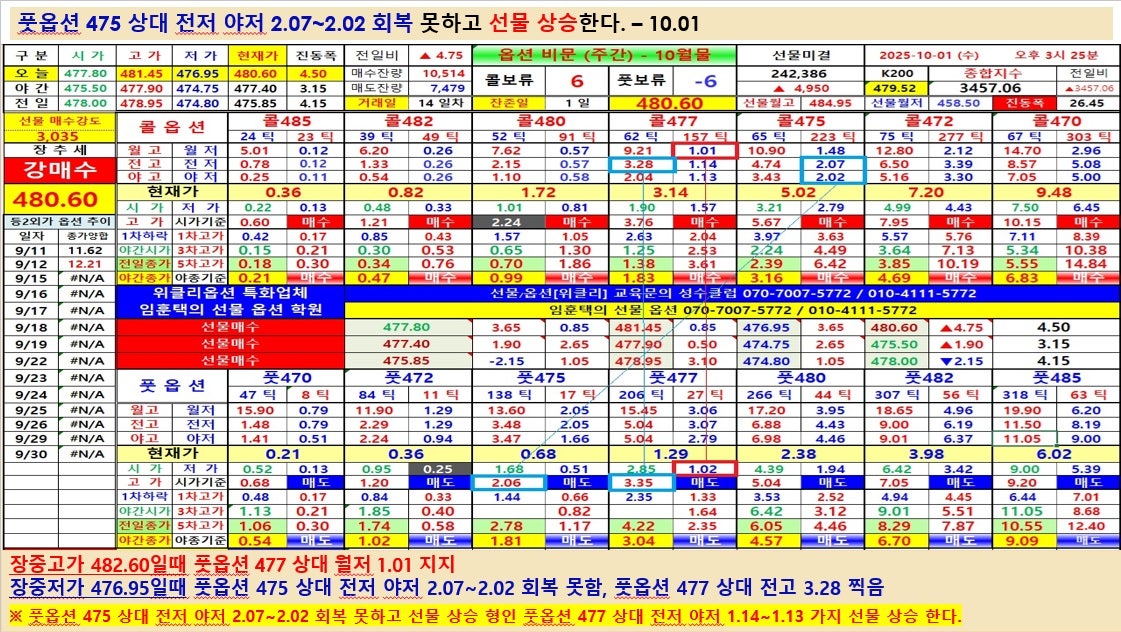 풋옵션 475 상대 전저 야저 2.07~2.02 회복 못하고 선물 상승한다. - 10.01