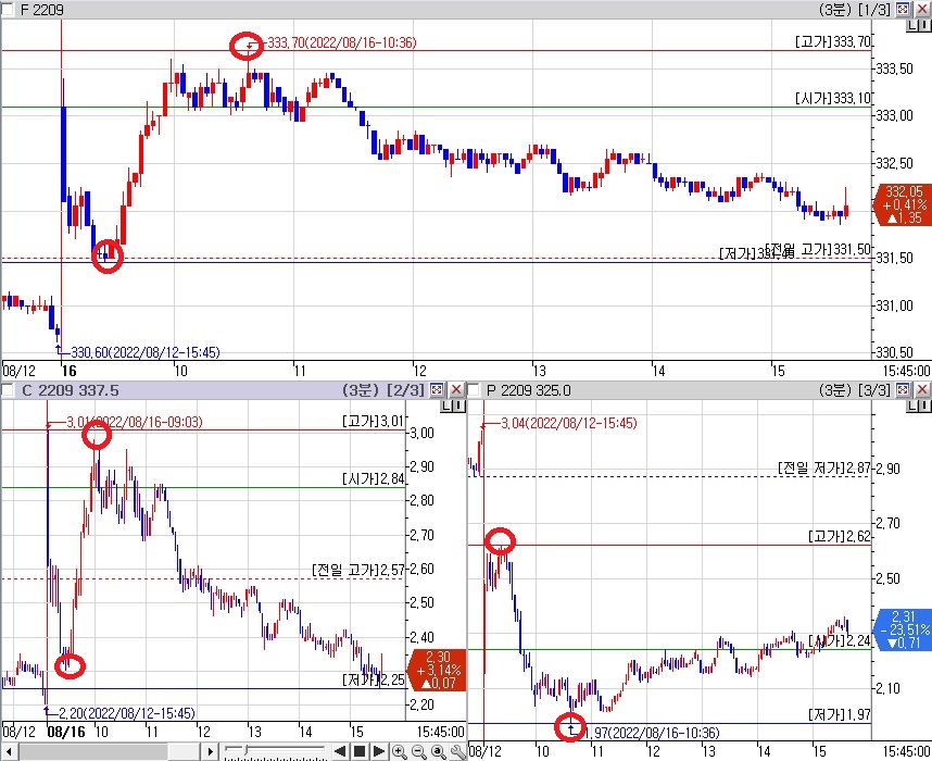 선물을 추가 상승하여 시가 기준에서 매수 진행 저점에서 찍어주었던 반대로 풋옵션 332상대 장중저가 4.39 콜옵션