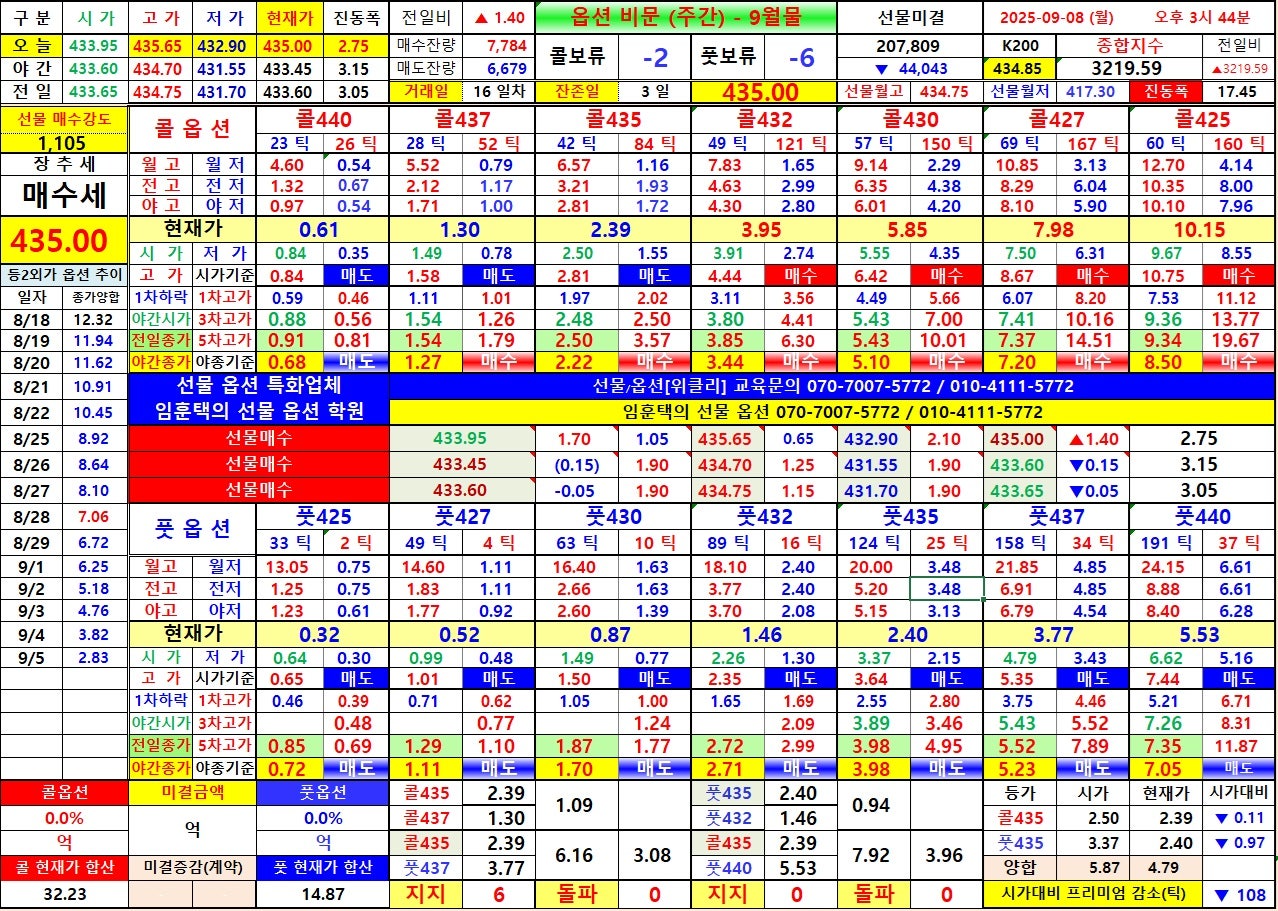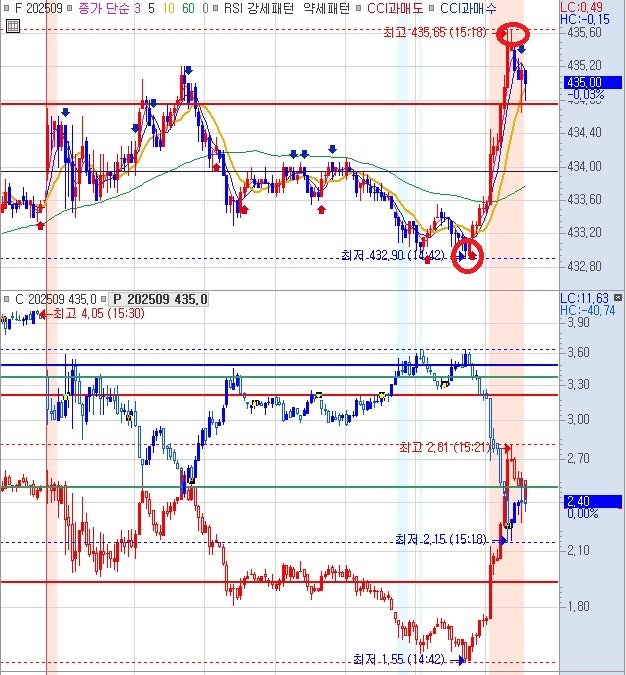 7) 선물 상승시 : 콜옵션 435 상대 월저 3.48 회복 → 콜옵션 435 상대 전고 5.20 까지, 풋옵션 432 상대 월저