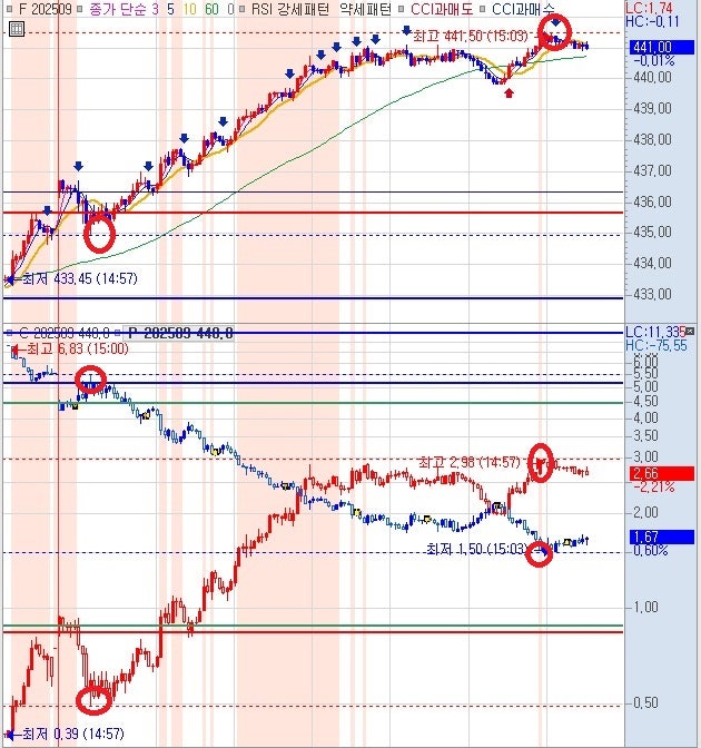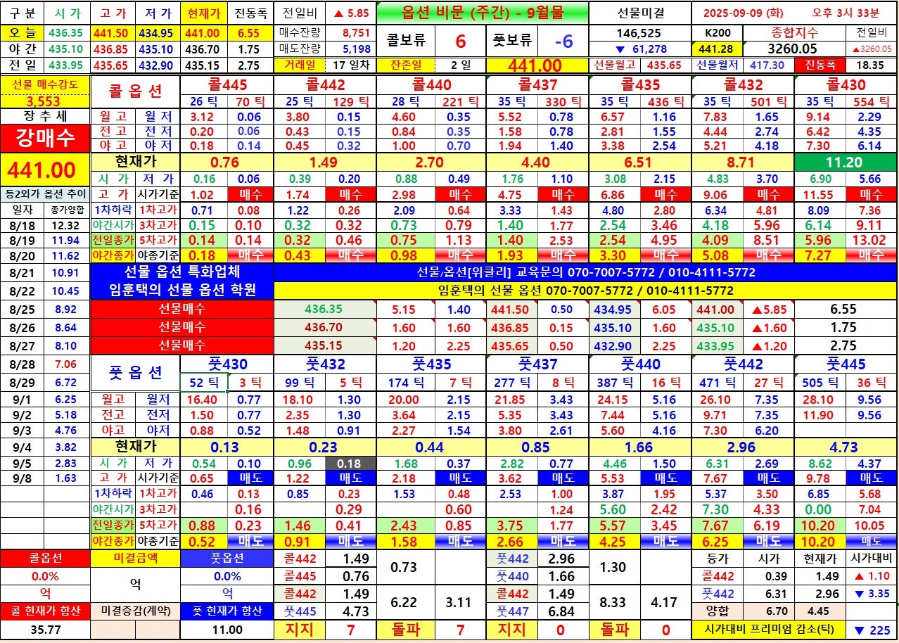 - 9시 10분 : 양 435 교차, 콜옵션 435 상대 월저 전저 2.15 지지