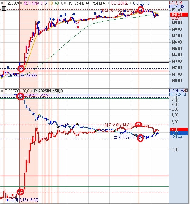 월저 전저 0.15~0.20 까지로 확인하며 11시 이후부터는 풋옵션 445 상대 장중저가 0.72~0.86 붕괴 시점 선물 상승