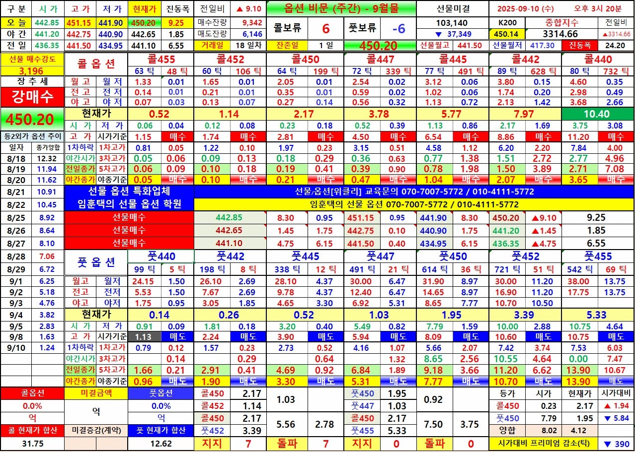 7) 선물 상승시 : 콜옵션 442 상대 야고 3.05 회복 → 콜옵션 445 상대 야저 3.30 까지, 풋옵션 442 상대 야저