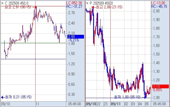 1) 콜옵션 450 1.82 시작하여 전종가 2.14 회복 못하고 하락하였으며 야저 1.35 저점을 찍고 상승 전종가 2.14