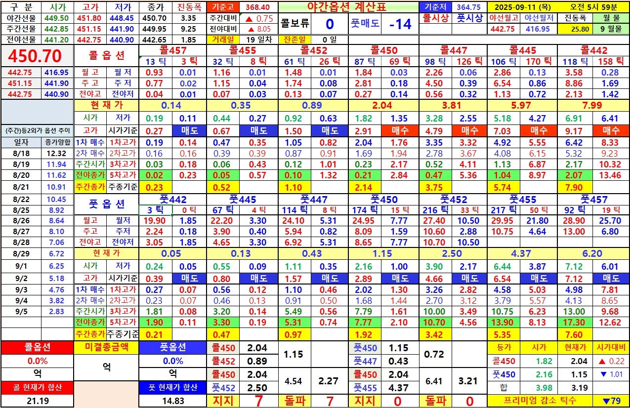콜옵션 450 상대 월저 전저 1.59 지지, 풋옵션 445 상대 전저 0.86 회복 못함