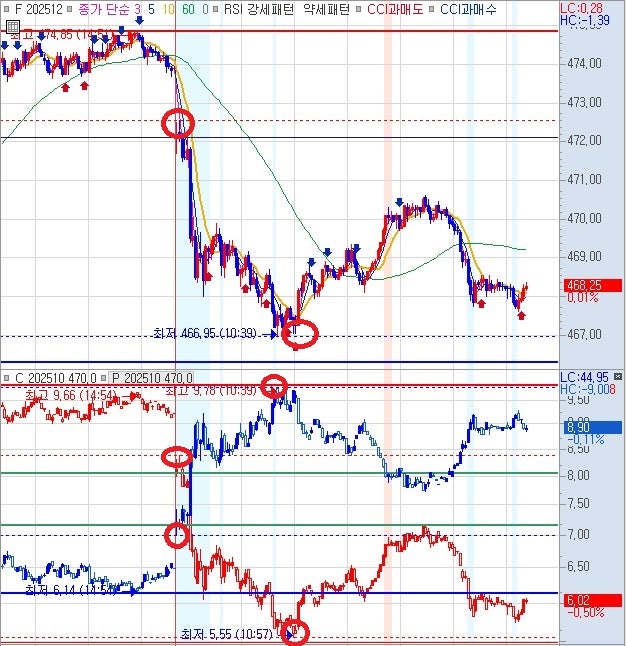 양 470 교차 미도달, 콜옵션 467 상대 전고 8.90 지지, 풋옵션 467 상대 전저 6.53 회복 못함