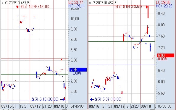 8) 선물 하락시 : 풋옵션 467 상대 야고 8.09 회복 → 풋옵션 467 상대 전고 9.79 까지, 콜옵션 467 상대 야저
