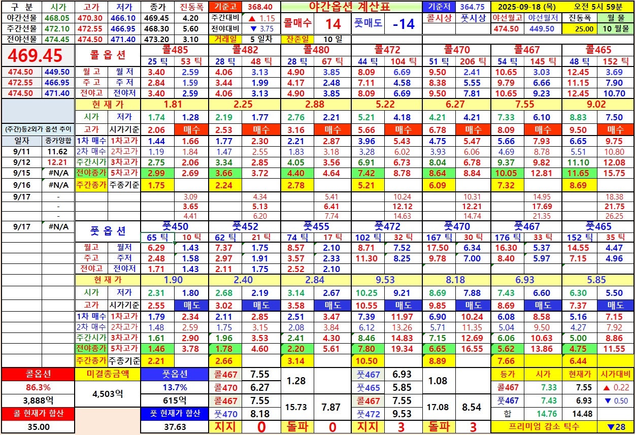7) 선물 상승시 : 콜옵션 467 상대 전고 8.40 회복 → 콜옵션 470 상대 전고 9.78 까지, 풋옵션 470 상대 야고