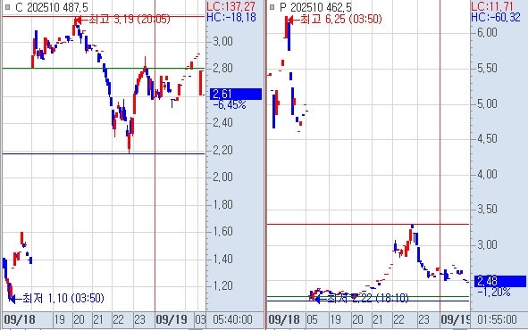 2) 콜옵션 487 하락할 때 야종가 2.61 아래에서 시작하여 전고 2.86 회복 못하고 하락 전종가 2.42 야저 2.18
