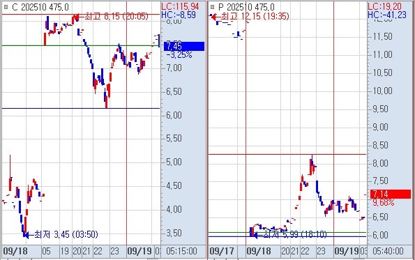 1) 양 475를 확인하면 야종가 콜옵션 475 7.45 , 풋옵션 475 7.14 로 7.20 교차를 확인