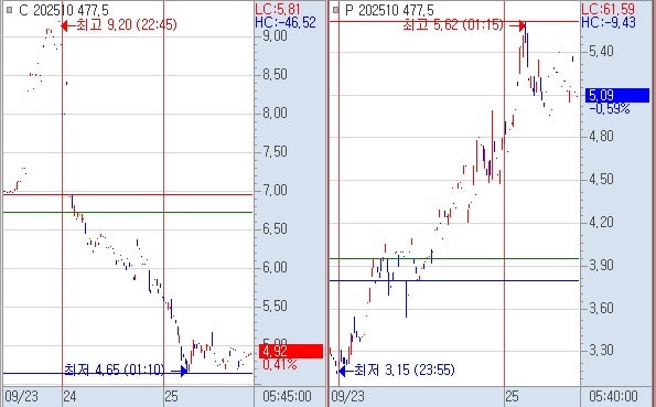 8) 선물 하락시 : 풋옵션 480 상대 전고 7.62 회복 → 풋옵션 475 상대 전저 6.00 까지, 콜옵션 477 상대 야저