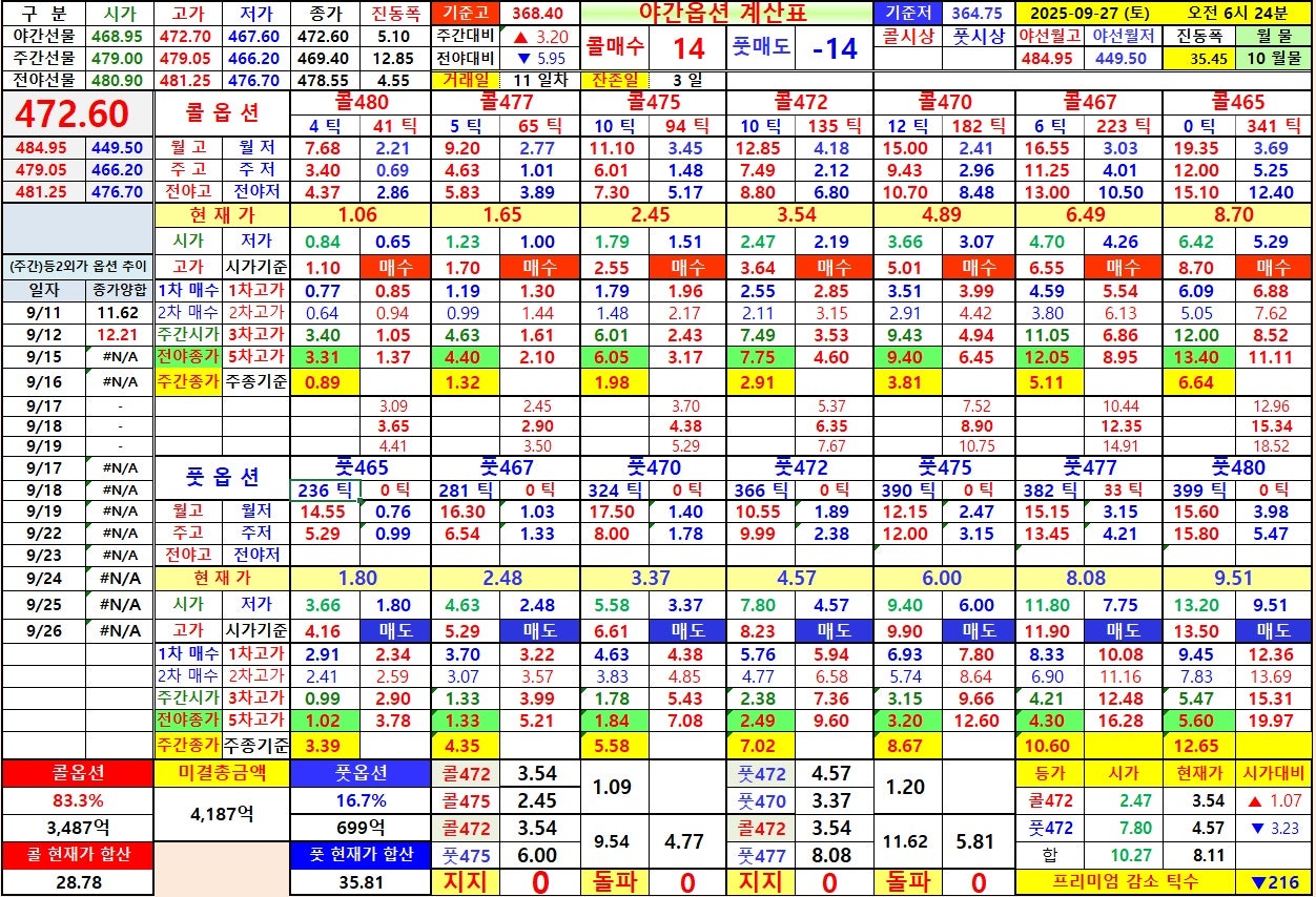 2) 선물 야간장 종가 472.60 으로 마감하였음으로 양 472 기준으로 확인