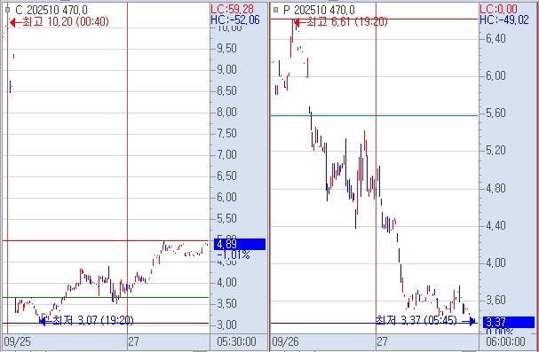 8) 선물 하락시 : 풋옵션 470 상대 야고 5.01 회복 → 풋옵션 472 상대 전고 7.49 까지, 콜옵션 472 상대 전저