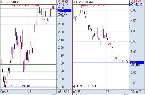 2) 콜옵션 475 하락할 때 전종가 1.98 아래에서 시작하여 야고 야종가 2.55~2.45 회복 못하고 하락 저점