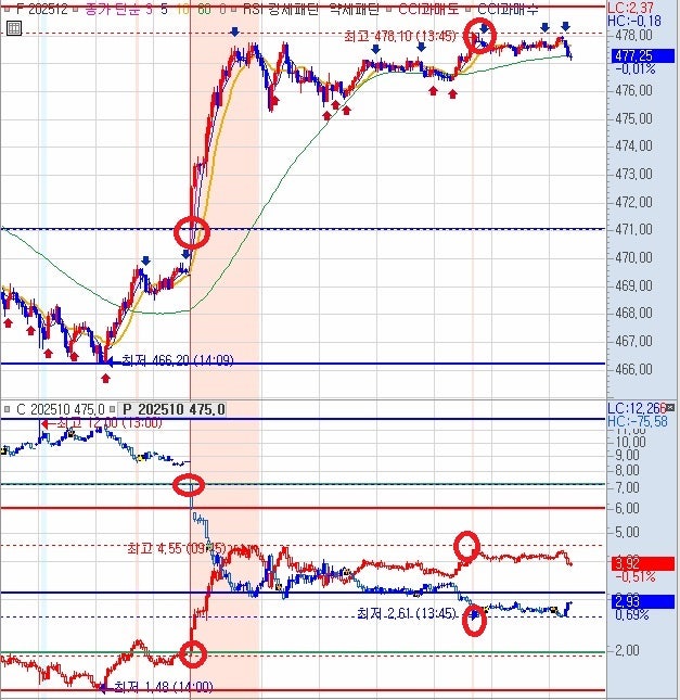 콜옵션 472 상대 장중고가 5.58 회복 시 선물 매수 단타대응 콜옵션 470 상대 전고 8.00 회복 콜옵션 465 상대 월고 12.50 회복