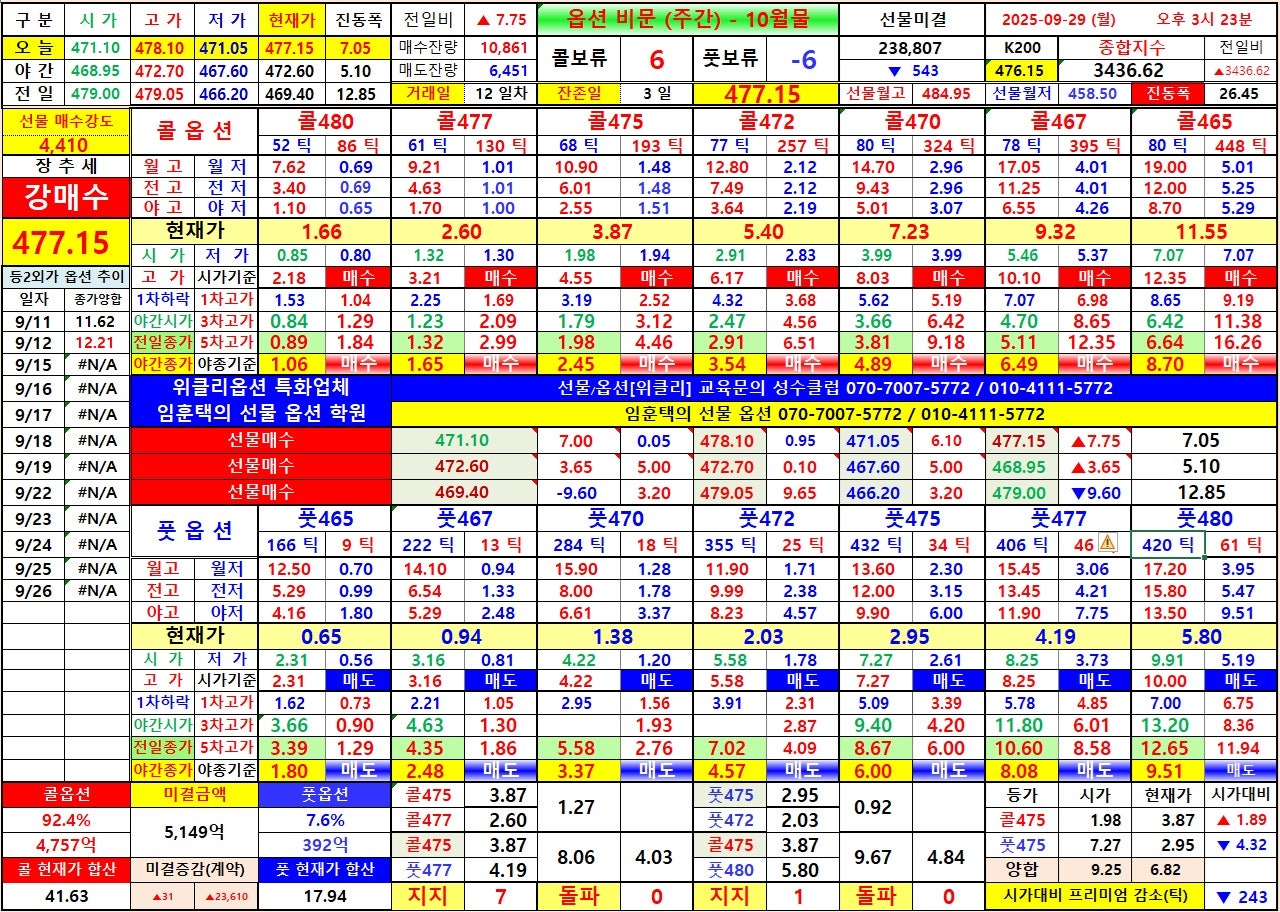 - 10시 00분 : 풋옵션 472 상대 저점 2.12~2.19 지지, 콜옵션 470 상대 전고 8.00 찍음, 콜옵션 465 상대 월고 12.50 회복 못함