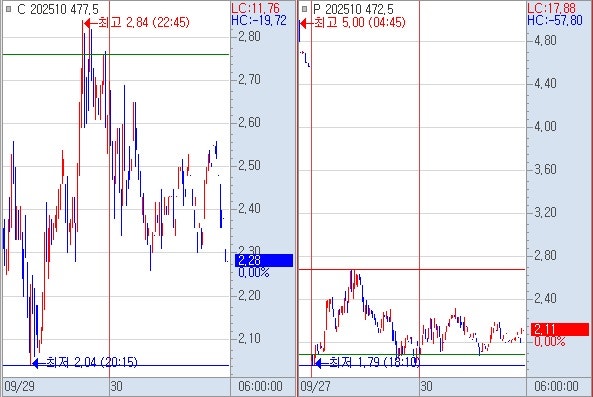 2) 콜옵션 477 하락할 때 전종 야종 2.50~2.28 아래에서 시작하여 야고 2.93 회복 못하고 하락 야저 2.04 붕괴