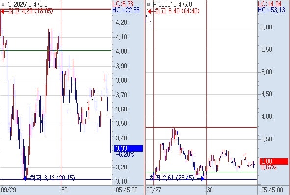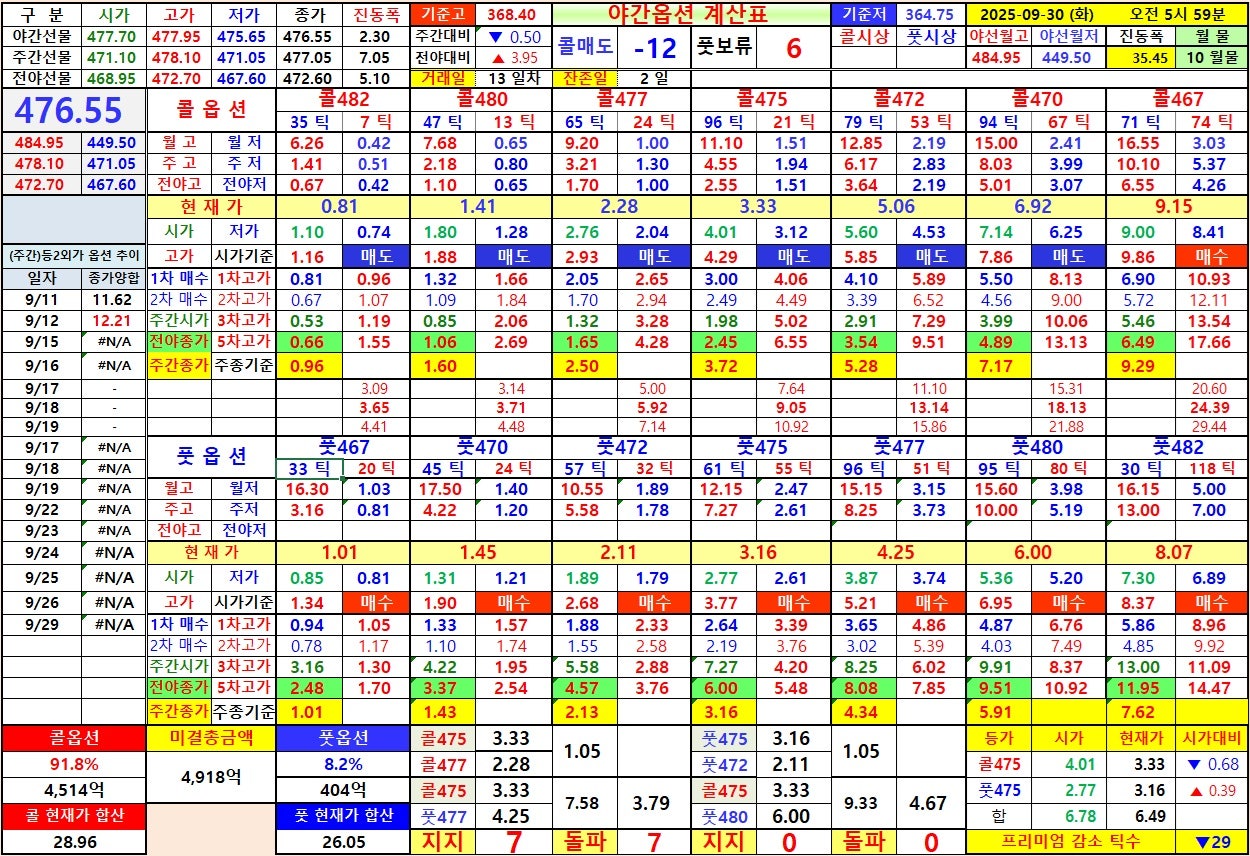 8) 선물 하락시 : 풋옵션 475 상대 전고 4.55 회복 → 풋옵션 472 상대 야저 4.53 까지, 콜옵션 475 상대 월저
