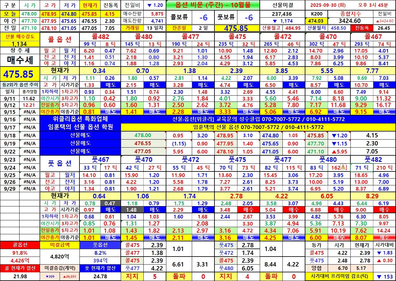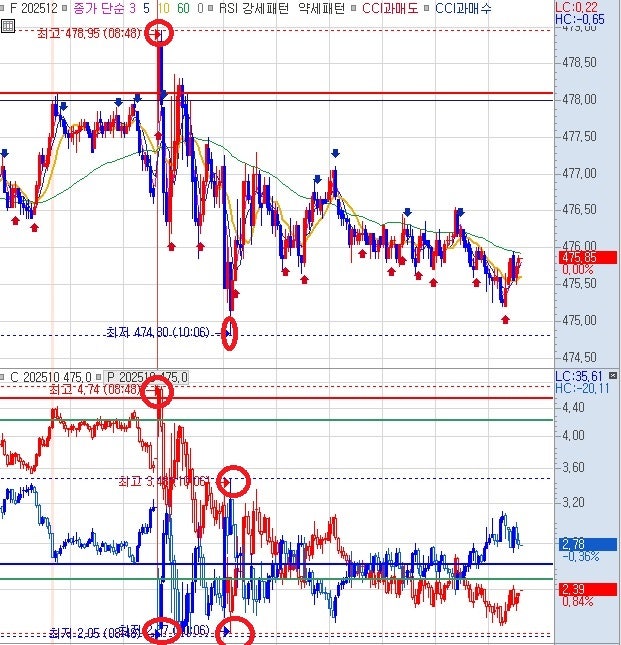 - 8시 50분 : 양 477 교차, 풋옵션 477 상대 전고 3.21 지지, 풋옵션 475 상대 전저 1.94 지지, 풋옵션 482 상대 월고 6.20 지지