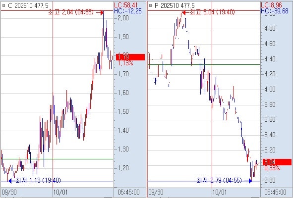 1) 양 477을 확인하면 야종가 콜옵션 477 1.83 , 풋옵션 477 3.04 으로 2.40 교차를 확인