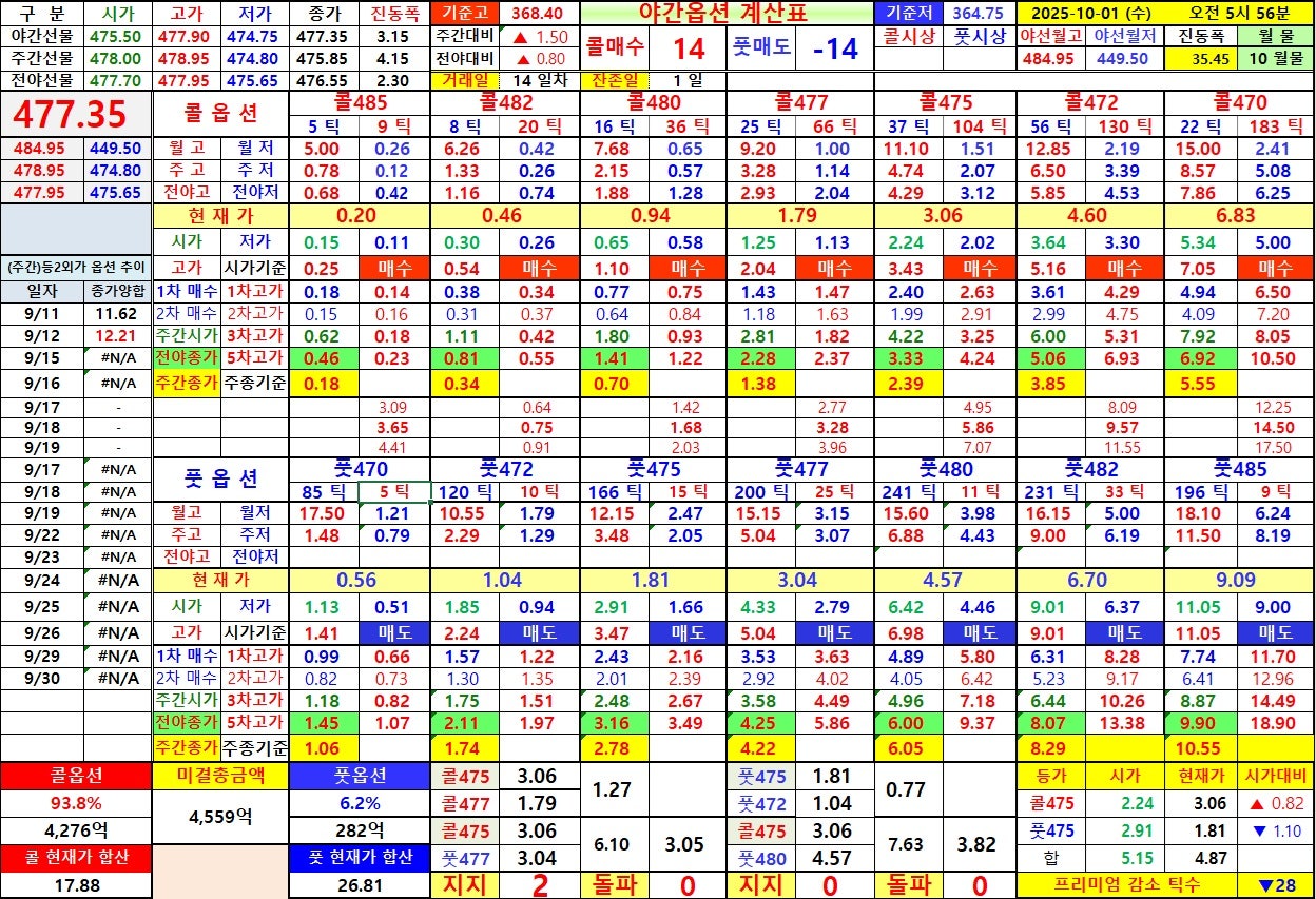 상대 월고 6.20 지지, 야저 474.75 일때 풋옵션 전고 회복 못함, 콜옵션 475 상대 월저 전저 2.05 지지, 풋옵션