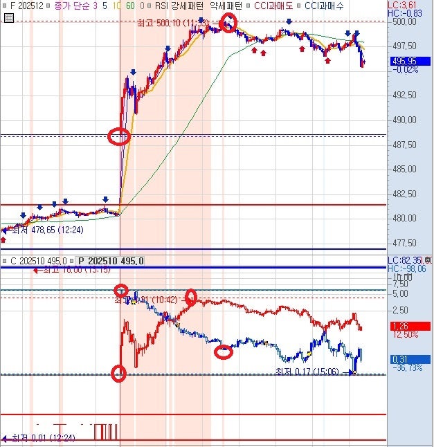 추가 하락 확인하고 콜옵션 482 상대 월저 전저 3.42 생명선으로 지지하여 상승 시 선물 상승 매수 대응