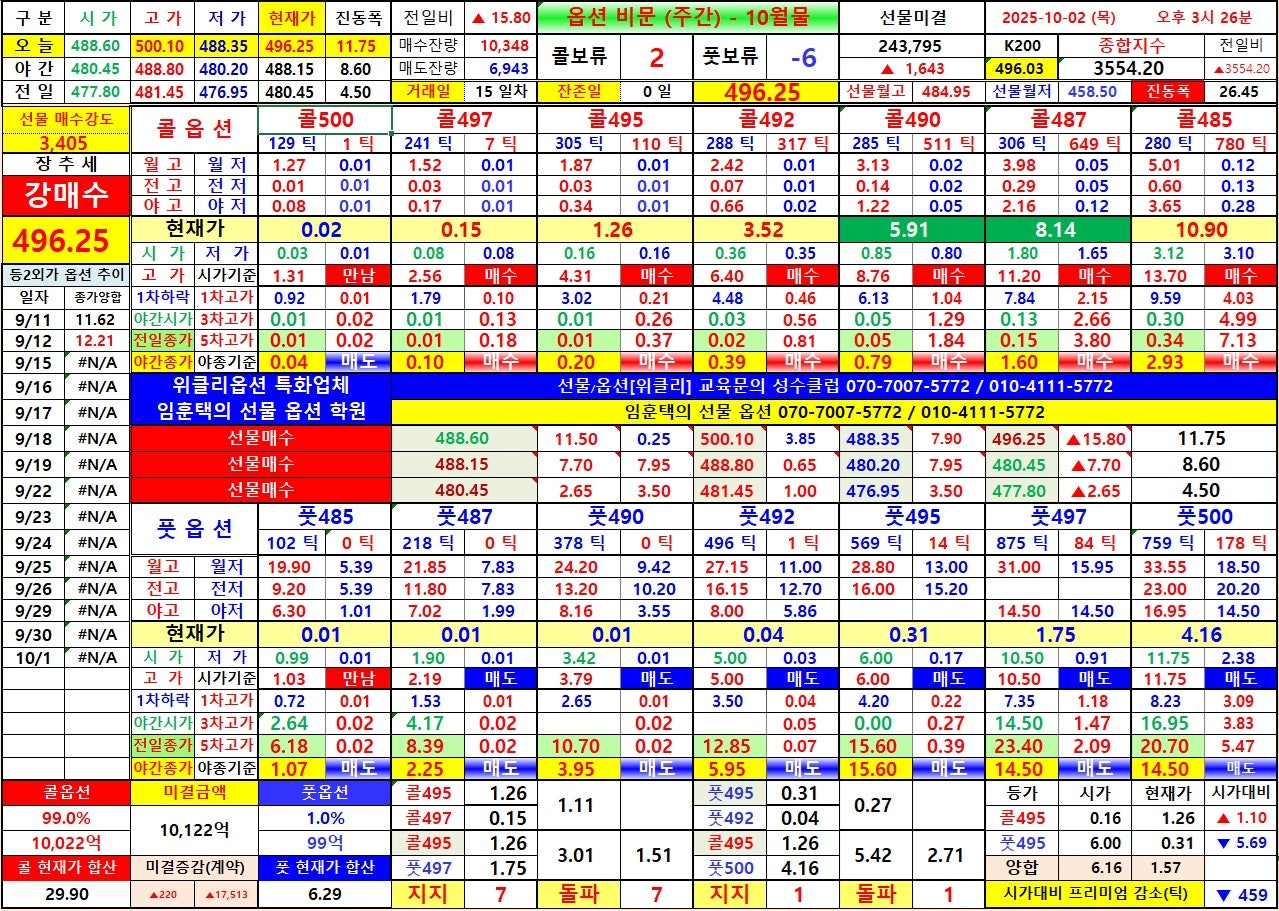 하락을 확인하였으며 시작시 풋옵션 487 상대 야고 2.16 회복 못함을 확인 선물 상승으로 확인하였고