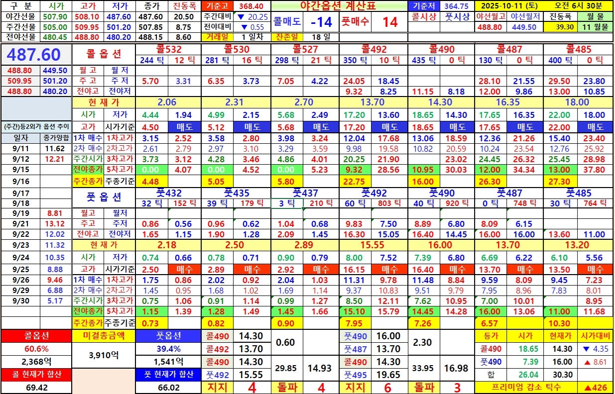 2) 선물 야간장 종가 487.60 으로 마감하였음으로 양 487,490 기준으로 확인