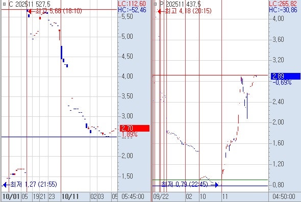 1) 콜옵션 527 5.68 시가 고가로 시작하여 하락 전저 4.22 붕괴 추가 하락하여 야저 2.49 저점을 찍고