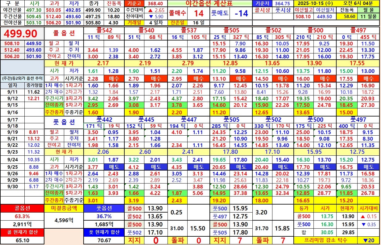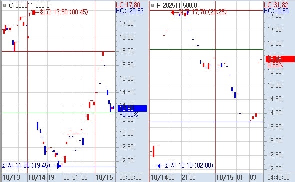 1) 양 500를 확인하면 야종가 콜옵션 500 13.90 , 풋옵션 500 15.95 으로 14.50 교차를 확인
