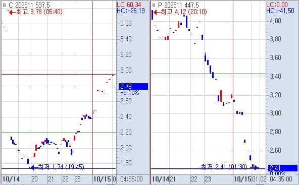 2) 콜옵션 537 하락할 때 야종가 2.79 아래에서 시작하여 야고 2.95 회복 못하고 하락 전종가 2.20 붕괴 시
