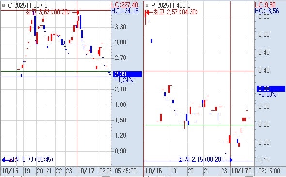 2) 풋옵션 462 2.25 시작하여 전저 2.18 쌍바닥을 지지 저점 2.15 저점을 찍고 상승 전고 2.43 회복 못하고 전저