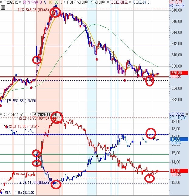 - 15시 00분 : 콜옵션 540 상대 장중저가 11.90 지지, 콜옵션 535 상대 월저 전저 14.80 지지