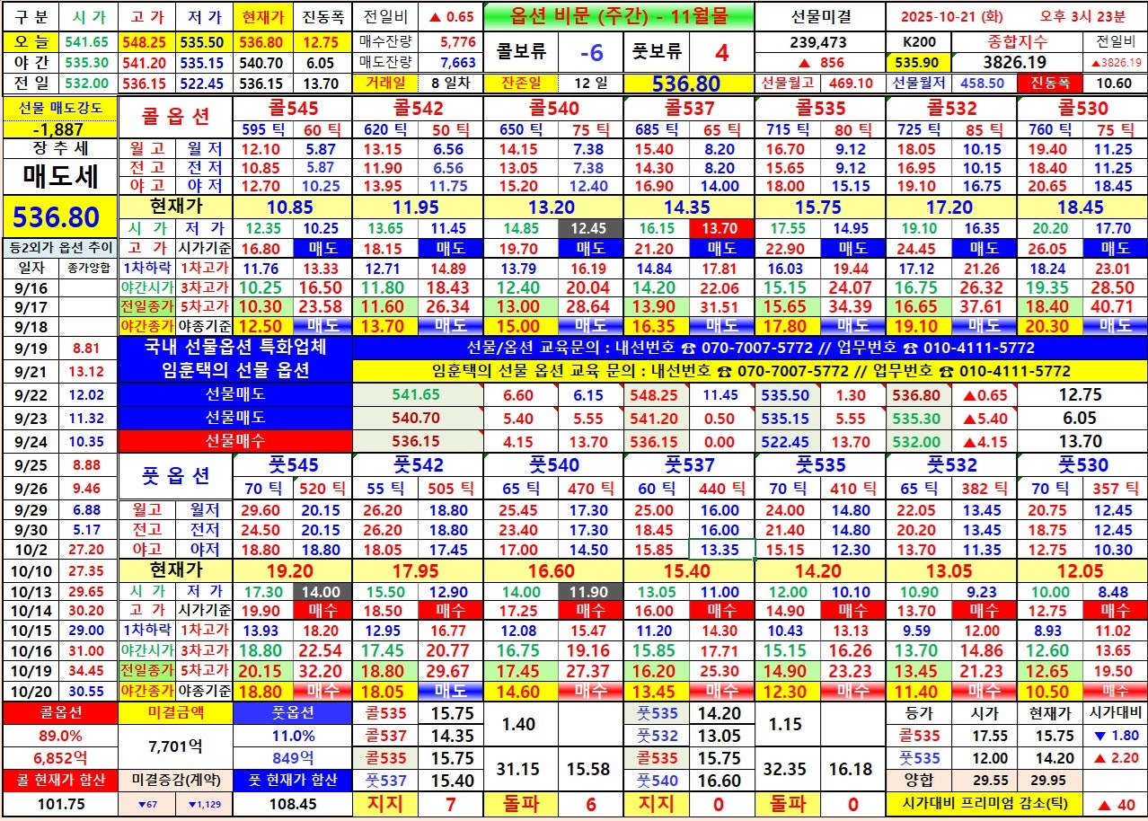 6) 선물 장중고가 541.20 일때 콜옵션 530 상대 월고 20.75 회복 못함, 야저 535.15 일때 양 535 교차, 콜옵션