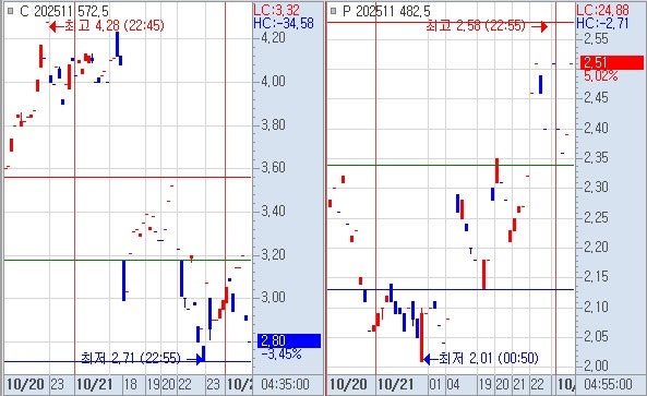 1) 콜옵션 572 상승하기 위해서 전저 야종가 2.80~2.86 위에서 시작하여 야저 2.71 생명선으로 지지하여 상승