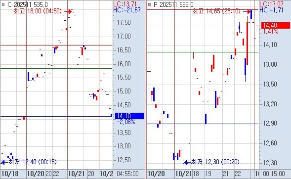 1) 양 535를 확인하면 야종가 콜옵션 535 14.10 , 풋옵션 535 14.40 으로 14.20 교차를 확인