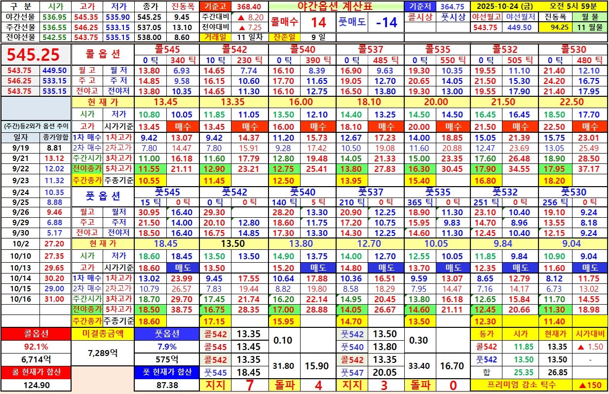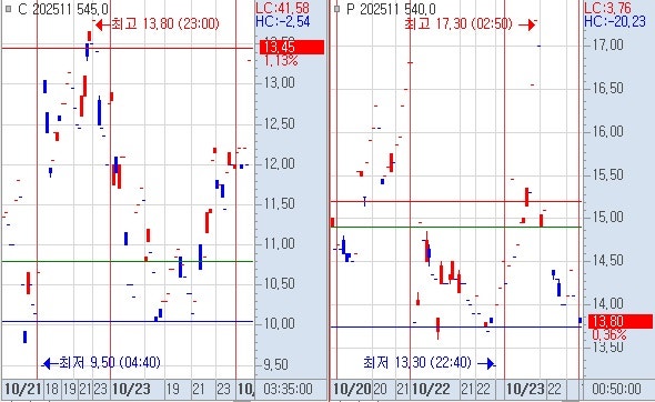 6) 선물 장중고가 546.25 일때 양 542 교차, 콜옵션 545 상대 월저 전저 14.00 회복 못함 풋옵션 537 상대 전저