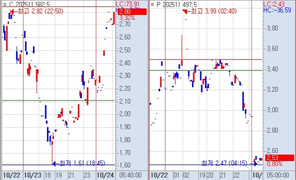 ※아래 내용은 콜옵션 582 풋옵션 497 기준으로 풀었습니다.