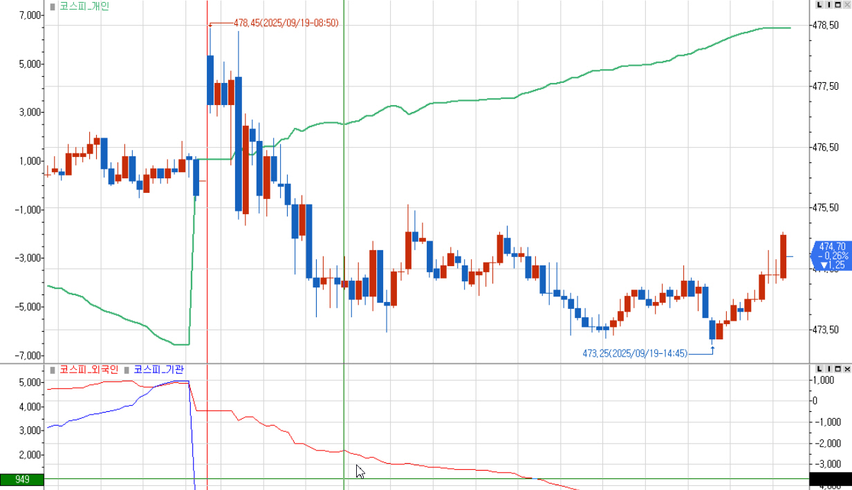 전환되어 등락을 반복하면서 저점을 다소 낮춰가서 474.70으로 전일대비 1.25