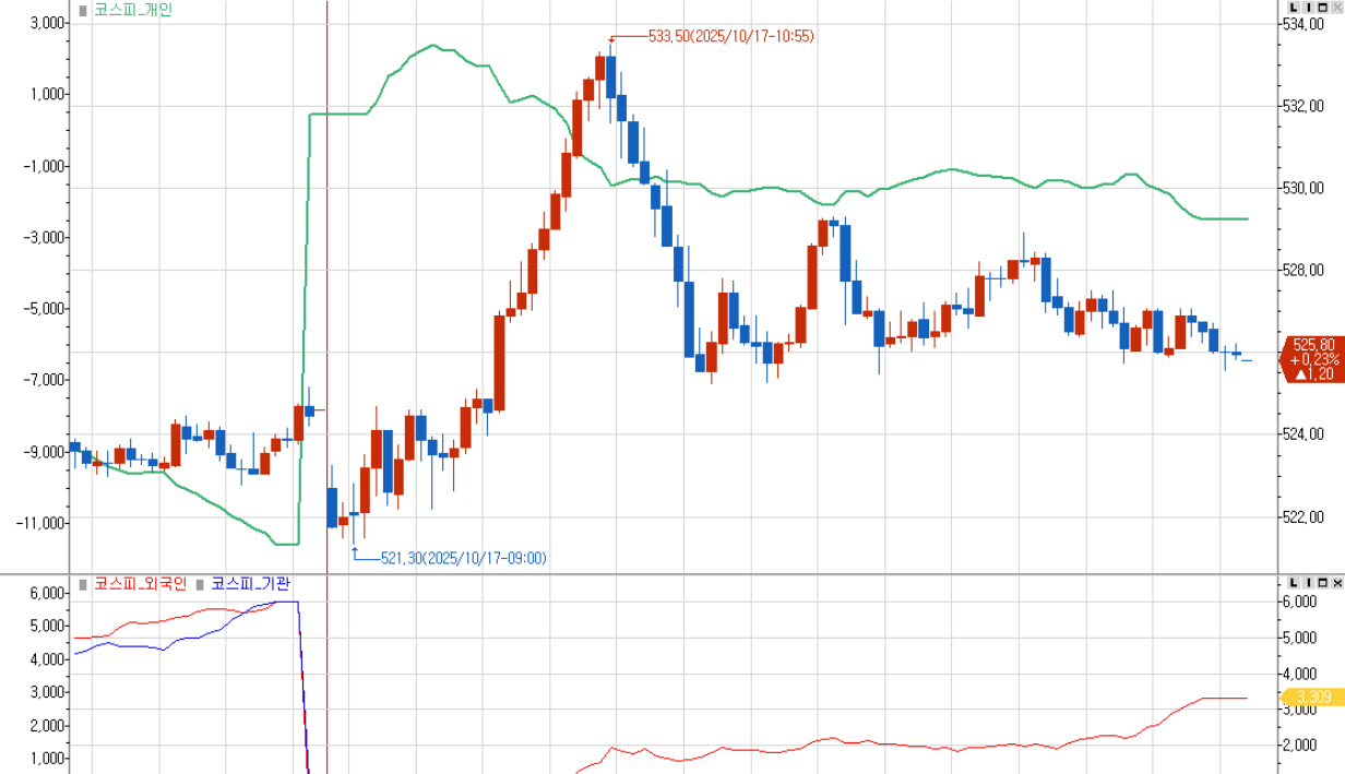 오늘 선물지수는 522.70으로 갭하락 시작했습니다. 이후 지수는 상승세로